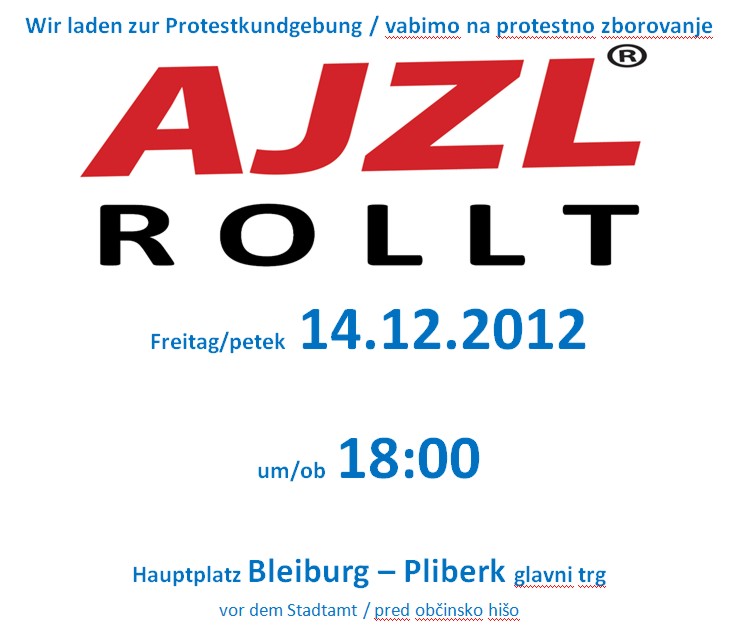 Wir lassen uns so nicht behandeln und fordern mehr Bürgernähe und politisches Fingerspitzengefühl! Daher rufen wir alle MitbürgerInnen und alle, die mit uns solidarisch sind, zur Protest- und Solidaritätskundgebung auf, bei der wir unseren „AJZL“ ins Rollen bringen und das Plumpsklo vorerst auf dem Hauptplatz von Bleiburg/Pliberk aufstellen wollen.