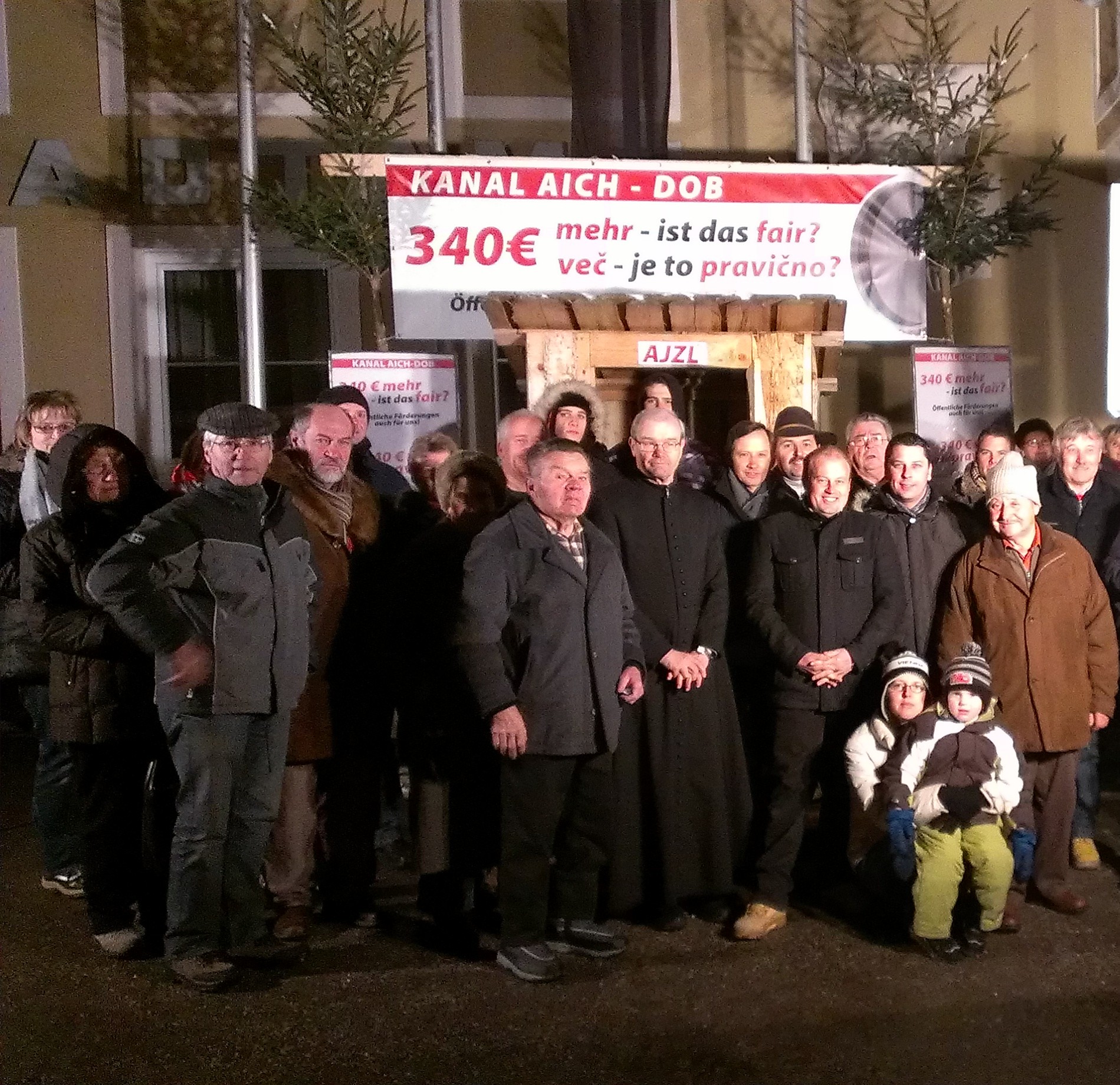 Die Bürgerinitiative/ljudska inicijativa Kanal Aich-Dob hat den „AJLZ“ – wie das Plumpsklo schon fast liebevoll genannt wird – ins Rollen gebracht. Er steht nun über Weihnachten als Mahnmal des Protestes am Hauptplatz, unmittelbar neben dem Stadtamt. „Wir protestieren aufs Schärfste dagegen, dass die Bevölkerung von Schilterndorf- Čirkovče, Wiederndorf-Vidra vas und Aich-Dob von der österreichischen Bundespolitik bisher völlig im Stich gelassen wurde“, brachte Initiativensprecher Logar den Protest auf den Punkt. Umwelt-Minister Berlakovich wird aufgefordert, endlich »einen mutigen politischen Akt« zu setzen.
