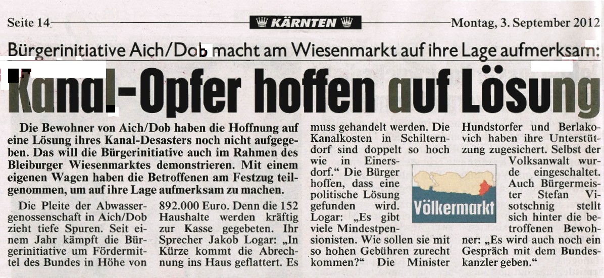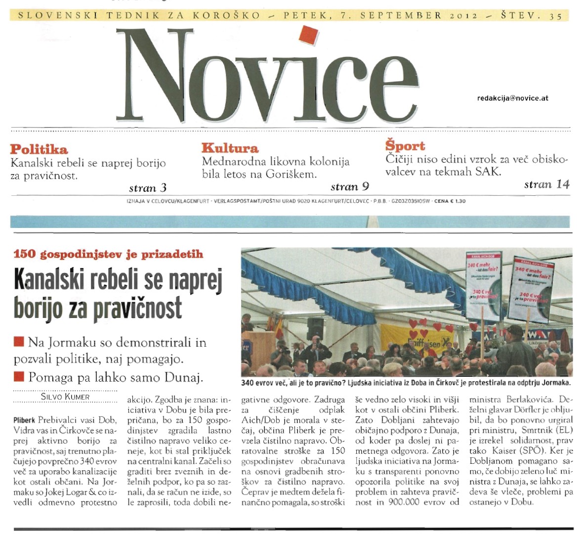 Seit einem Jahr kämpft die Bürgerinitiative/ljudska iniciativa Kanal Aich-Dob gegen die ungerechte Verdoppelung der Kanalgebühren. Protestveranstaltungen, unzählige Gespräche mit Politikern, Gespräche mit zwei Ministern und intensive Medienarbeit haben noch immer nicht das gewünschte Ziel gebracht.